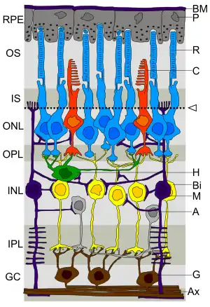 A conceptual illustration of the structure of the retina is shown on the right. As we can see, there are five main cell types: