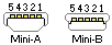 USB Mini-A, and -B plugs showing pin numbers (not to scale)