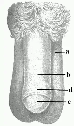The penis is a long, tube-like organ that is in the front of a man's body, in the groin area. The base of the penis connects in the groin (lower middle abdomen between the legs. The length of the penis is unimportant for reproduction, fertility or manliness, and can vary between 5cm and 20cm (2-8 inches) with an average of about 13cm (5 inches) for an erect adult over age 18. The middle area (the "shaft" of the penis) terminates in a pink gland where the urethra is exposed (the "head" of the penis). The base of the penis is frequently covered in pubic hair. The head of the penis is covered by the foreskin, which can be pulled back to expose the head itself. Men who are circumsized have had their foreskins removed (typically as infants).