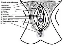 At the front of the vulva is a small structure called the clitoris. The clitoris is very sensitive to stimulation. During fetal development, the cells that in males develop into the penis, in females develop into the clitoris. The clitoris has more nerve endings than a male's penis, and even light stimulation can cause sensations of pain or discomfort. The clitoris is surrounded by folds of flesh known as the clitoral hood. The clitoral hood can be pulled back to expose the tip of the clitoris underneath.