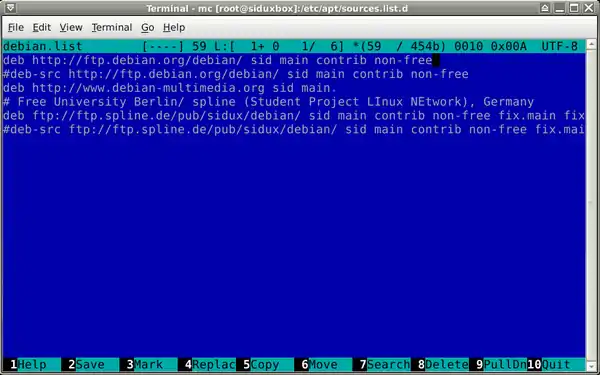 - g. Enter file: /etc/apt/sources.list.d/sidux.list and change the line for: