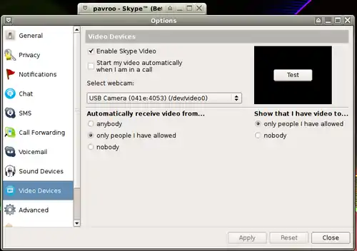 - 6. Next enter Options-> Video Devices and make webcam test.