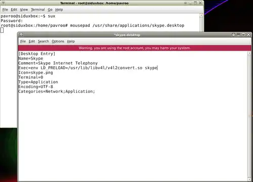 - 5. If your webcam doesn't want to work with Skype just edit "skype.desktop" file as root-> Terminal: