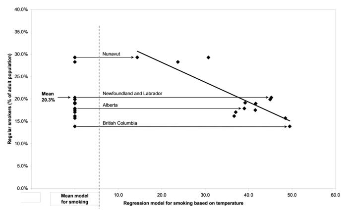 Figure 4-9. Regression of smoking rates on average temperatures across the 13 Canadian provinces and territories, 2008