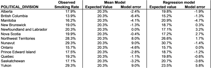 Figure 4-11. Comparison of model error in mean and regression models of smoking rates across the 13 Canadian provinces and territories, 2008