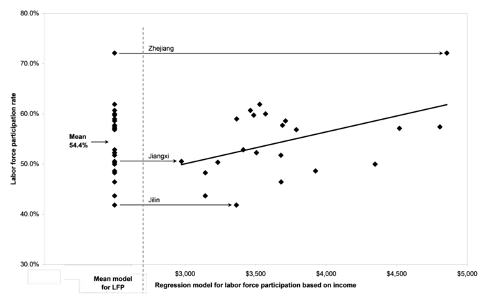 Figure 4-16. Mean and regression models of labor force participation rates across the 22 Chinese provinces, 2008