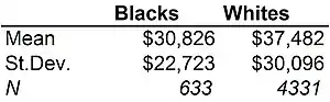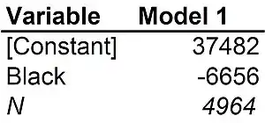 The United States has a long and troubled history of discrimination and repression based on race. Until 1865, slavery was widespread in the United States, with rich white people legally owning, oppressing, and abusing black people. For the next century between 1865 and 1964 the race-based segregation of schools, businesses, and other public places was legal, and in much of the country black Americans were prohibited from fully participating in society. Any American over age 50 today was born in a segregated country that did not give equal rights to its black citizens. It is not surprising that racial discrimination is still a major problem in America despite the election of America's first black President. After all, Barack Obama himself was born in a legally segregated America. One outcome of the long history of racial discrimination in America is a continuing wage gap between blacks and whites. Even blacks born long after the end of official segregation in American earn substantially lower salaries than whites of the same age. The race gap in wages can be illustrated using data from the 2008 US Survey of Income and Program Participation (SIPP). Wave 2 of the 2008 SIPP includes wage income data for 4964 employed Americans aged 20-29 (633 of them black and 4331 of them white). The overall mean income in the SIPP sample is $36,633 with a standard deviation of $29,341. The conditional mean incomes of the 633 blacks and 4331 whites in the SIPP sample are reported in Figure 5-1. The black mean is $6656 lower than the white mean.