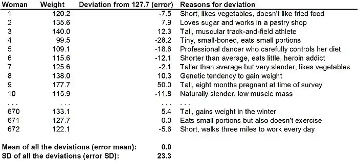 Clearly, the 672 women surveyed in the 1960-1964 NHANES recorded much lower weights than the 706 women surveyed in the 2003-2006 NHANES. Does that mean that women really were lighter in the 1960s? It probably does, but both means are associated with large amounts of error. There is error in the mean model because every person in the NHANES database deviates from the national mean for various different reasons. Potential reasons why an individual person's weight might deviate from the mean weight for people of the same gender nationwide might include things like: A person's height How much a person eats How much a person exercises A person's genetic tendency to store energy as fat The 672 women represented in the first column of Figure 5-3 had a mean weight of 127.7 lbs. Of course, they did didn't all weigh 127.7 lbs. Even in the early 1960s, not everyone looked like Marilyn Monroe. Given the standard deviation of 23.3 lbs. reported in Figure 5-4, most women in their 20s would have weighed between 104.4 and 151.0 pounds. A made-up sample of some of the 672 women from the 1960-1962 NHANES and the reasons why they might have deviated from the national mean weight is presented in Figure 5-4. In reality, each woman would have had hundreds or thousands of individual reasons for deviating from the mean. Everything we eat or drink, every step we take, and even the amount of time we spend sleeping can affect our weight. Even a woman who weighs exactly the mean weight might have reasons for being heavier than the mean and reasons for weighing less than the mean that just happen to cancel each other out.