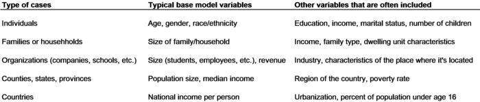 9.1. The base model Compared to the models used so far in this book, models like those reported in Figure 8-16 and 9-2 have a large number of independent variables. Most regression models used by social scientists include many independent variables, from 6 or 8 up to sometimes 20 or more. When models include so many variables, it is necessary to have some way to organize them. A good place to start is with a base model. Base models are initial models that include all of the background independent variables in an analysis that are not of particular theoretical interest for a regression analysis. For example, in studying the relationship between social status and trust in society, variables like gender, age, town size, and all the other variables included in Model 1 of Figure 9-2 are not of particular theoretical interest. They are only included in order to control for the backgrounds of the people in the study. Model 1 would be considered a base model for Figure 9.2. The kinds of variables that are typically used in base models for different kinds of data are summarized in Figure 9-3. The variables to be included in a base model often depend simply on what data are available. For databases where the cases are individuals, many different variables are usually available. As you move up the chain to larger and larger units, less and less data are available, and so fewer and fewer base model variables tend to be included. For models comparing countries, the one variable that is almost always included is national income per person. The inclusion of national income in regression analysis helps adjust for the fact that rich countries like the United States and Japan are different in almost every way from poor countries like Cambodia and Haiti. If a researcher using cross-national data didn't control for national income, people who disagrees with the researcher's views would almost certainly raise this as a major criticism of the researcher's regression models.