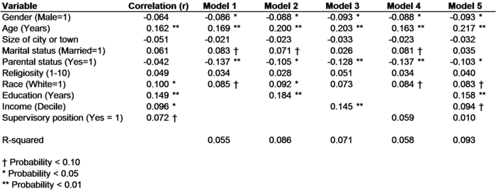 Model 1 includes all the background factors together in a single regression model. Interestingly, marriage and parenting seem to complement each other. Neither marital status nor parental status is significantly correlated with trust in society, but in the regression model both variables are significant when controlling for the other. Model 2 also includes all of the background factors, but adds education, which is highly significantly related to trust in society. In Model 3, income is found to be highly significantly related to trust in society, but in Model 4 the effect of holding a supervisory position at work is non-significant. In the final model, Model 5, the only social status variable that has a highly significant coefficient is education. The fact that the coefficients of all three social status variables are smaller in Model 5 than in the other models indicates that these three variables compete with each other in explaining trust in society. This would be expected, since they are all different ways of operationalizing the same concept. People who are highly educated tend to have high incomes and supervise other people at work, while people who are poorly educated tend to have low incomes and not supervise other people at work. Since the (standardized) coefficient for education in Model 5 is much larger than the (standardized) coefficients for income and supervisory position, we can conclude that education is the most important of the three social status determinants of trust in society. Which of the five models is the best model for explaining how social status affects trust in society? That depends on just what it is that the researcher wants to know about the effects of social status. All of the models add information that might be useful. A fuller picture of the determinants of trust in society can be developed using all five models than from any one of the models by itself.