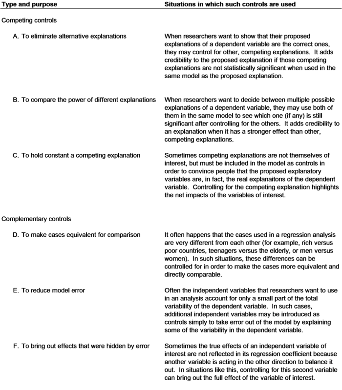 9.3. Reasons for controlling in explanatory models A major challenge in designing regression models is deciding just what to control for. In predictive models, the decision is easy: if a variable is available for use and it helps predict the dependent variable, use it. In explanatory models, the decision is much harder. There are at least six reasons why control variables might be used in an explanatory model, though others are possible as well. They are: A. To eliminate alternative explanations B. To compare the power of different explanations C. To hold constant a competing explanation D. To make cases equivalent for comparison E. To reduce model error F. To bring out effects that were hidden by error The first three reasons (A-C) mainly apply in cases where the control variable tends to compete with other independent variables in explaining the dependent variable. In such cases, the use of the control variable tends to reduce the size and statistical significance of the effects of the other independent variables. The last three reasons (D-F) mainly apply in cases where the control variable tends to complement the other independent variables. In such cases, the use of the control variable can actually increase the size and significance of the effects of the other independent variables. The six reasons and explanations of the kinds of situations in which they are used are summarized in Figure 9-5.