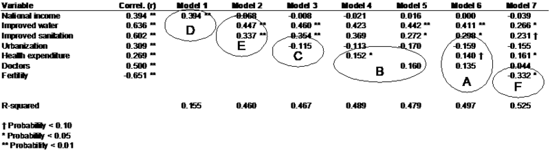All six reasons for using control variables can be illustrated using a series of regression models that are designed to shed light on the reasons why some countries are more successful than others at immunizing their children against common infections. Though there are some controversies surrounding its use, the combined diptheria-pertussis-tetanus (DPT) vaccine is widely used around the world to immunize infants between 12 and 23 months old against three potentially deadly childhood diseases. The World Health Organization and most national health authorities have official DPT immunization programs. Nonetheless, DPT immunization rates vary from under 40% in some of the poorest countries of Africa to over 98% in many of the middle-income countries of the middle east and eastern Europe. The DPT immunization rate is not a major policy issue in rich countries, both because immunization rates are usually over 90% and because the three diseases -- diptheria, pertussis, and tetanus -- are not generally life threatening in countries with good medical systems. On the other hand, in poor countries DPT immunization can literally be a matter of life and death for young children. From a policy standpoint, we would like to understand why DPT immunization programs are more successful in some countries than in others, especially in poor countries. Several explanations are possible. First, in many rich countries DPT immunization rates fall well below their potential because of parental concerns about the safety of vaccines, combined with the fact that these diseases are now so rare that most people no longer fear them. Parental fear of vaccines is difficult to measure, but (with a few exceptions) it doesn't seem to be a major factor in most poor countries. It would be useful to study the effects of parental fear across countries, but the data simply aren't available. Other explanations include countries' levels of development, how easy it is to reach infants who need to be immunized, the amount that countries spend on health, the number of trained medical personnel in a country who could give immunizations, and the number of children to be immunized. Specific variables that might be used to operationalize each of these explanations are: Level of development National income -- national income per person ('000s of US Dollars) Improved water -- percentage of the population with "improved" water supply (e.g., a well) Improved sanitation -- percentage of the population with "improved" sanitation (e.g., an outhouse) Ease of reach Urbanization -- urban population (percent of the total population) Health spending Health expenditure -- national health expenditure as a percentage of national income Trained personnel Doctors -- number of physicians per 1,000 population Number of children Fertility -- the mean lifetime number of children per woman Other variables could be included, but data for DPT immunization rates plus all seven of these explanatory variables are available in the World Development Indicators for 100 countries representing over 85% of the world's poor countries by population. From a social policy standpoint, we are particularly interested in knowing what can be done to increase the immunization rate. We can't easily make a country richer or more developed, and we can't do much to make children easier to reach or make there be fewer children. On the other hand, we can give countries foreign aid to help them increase their spending on health. We can also seek volunteer doctors to help in administering immunizations. An important policy question is thus: which would be more useful, giving money or finding volunteers? The series of regression models for DPT immunization presented in Figure 9-6 help answer this question. They also illustrate the six reasons for using control variables. The letter for each reason has been attached to its corresponding illustration in the regression table.