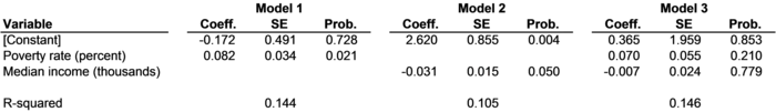 As would be expected, counties that have higher poverty rates also have higher murder rates (Model 1). Every 1% increase in the poverty rate is associated with a 0.082 person increase in the number of people murdered per 100,000 population. That's not a lot, but it is statistically significant (probability = 0.021, which is less than 5%). Also in line with expectations, counties that have higher median incomes have lower murder rates (Model 2). Every $1000 increase in median income is associated with a 0.031 person decline in the number of people murdered per 100,000 population. Again, the relationship is small but (just) statistically significant (probability - 0.050, or 5%). In Model 3, however, neither poverty nor income is significantly related to the murder rate. Both variables have non-significant coefficients. A researcher who only looked at Model 3 without running models like Model 1 and Model 2 that examined the effect of each variable individually might conclude that neither poverty nor income was significantly related to murder rates. This error is called the "partialling fallacy." The partialling fallacy is a false conclusion that independent variables are not related to the dependent variable when, in fact, they are. The partialling fallacy label applies only in those situations where the variables partialling each other are meant to operationalize the same concept. There are at least three ways around the partialling fallacy. The simplest is to pick just one operationalization of the concept and ignore any others. A better approach is to combine the multiple operationalizations of the concept into a single variable. At the most sophisticated level, multiple operationalizations of a concept can be used together in a model and their joint power to explain the dependent variable studied through their collective impact on the model's R2 score. Notice how the R2 score in Model 3 is slightly higher than that from Model 1 (0.146 versus 0.144). This indicates that poverty and income together explain slightly more of the cross-city variation in murder rates than does poverty alone. The joint analysis of R2 scores has the advantage that it allows the researcher to use all of the available data in all its complexity. On the other hand, complexity is also its main drawback. Sometimes joint analysis adds value, but most times it makes more sense just to keep things simple. Model 1 explains nearly as much of the variability in murder rates as Model 3, without the distraction of managing multiple variables. It would be a reasonable compromise to study city murder rates based on city poverty levels, without worrying about median income.