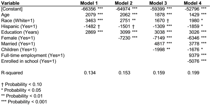 Model 1 is a base model that includes four background variables: the respondent's age, race, Hispanic status, and years of education. As expected, people have higher incomes when they are older, white versus black, non-Hispanic, and more educated. In Model 2, the coefficient of -7230 indicates that, on average, twentysomething women earn $7,230 less per year than twentysomething men, even after controlling for age, race, Hispanic status, and years of education. Model 3 adds two family variables, marriage and children. Married people earn more than single people and people with children earn less than people without children. These two variables remove some error from the model, but they have very little effect on the gender gap. The possibility that women make less than men because of family obligations can safely be discarded as a competing explanation for women's lower wages. The final, saturated model (Model 4) adds two labor market variables: whether or not people work full-time and whether or not they are attending school (which might mean that they're not working to full potential). Controlling for these competing explanations does reduce the gender gap, but only by $803, from $7,149 to $6,346. These competing explanations both have highly significant coefficients and seem to be important determinants of wages, but they do not explain the majority of the wage differences between women and men. Though the gender gap may not be due to discrimination, we can conclude from the models presented in Figure 9-8 that it probably isn't caused by family factors or labor market factors. Incidentally, it is impossible for any of the variables in Figure 9-8 to be confounded with gender because gender is determined randomly at the time of conception, but there may be other confounded effects. For example, it is possible that older people are more educated (since the youngest people in the sample would not have finished their educations by the time of the study) and earn higher wages, so education is likely to be confounded with age. This might be a problem if the purpose of the analysis was to understand the relationship between education and income, but age and education are used here only with the intent of making cases equivalent for comparison. Similarly, marriage and children may be confounded, but again this is not an issue from the standpoint of the gender gap. The models presented in Figure 9-8 are reasonably parsimonious. Very few variables are included, and all of them have statistically significant effects. A fuller model of twentysomething wages might control for many more variables and still not be considered overly complex. For example, an important alternative explanation of the gender gap in wages is that it might be due to women's choices of what industry to work in. This will be investigated further in Chapter 10.