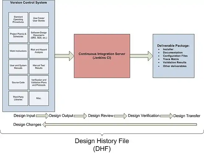 Continuous Integration refers to both the continuous compiling and building of a project tree and the continuous testing, releasing and quality control. This means that throughout the project, at every stage, the development team will have a build available with at least partial documentation and testing included. The CI Build is used to perform certain tasks at certain times. In general, this simply means that builds are performed in an environment that closely matches the actual production environment of the system. In addition, a CI environment should be used to provide statistical feedback on build performance, tests, and incorporation of a version control system and ticketing systems. In a development environment, the team may use a version control tool (i. e. Subversion) to link to tickets. In this way, any CI build will be linked to a specific changeset, thereby providing linkage to Issues, Requirements and, ultimately, the Trace Matrix. To this end, the CI environment, used properly, can be the DHF.