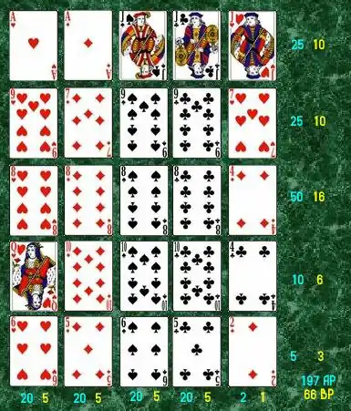 The end of a game of Poker Solitaire. The blue numbers represent the point values of the hands in the American System, while the yellow numbers represent that of the English System.