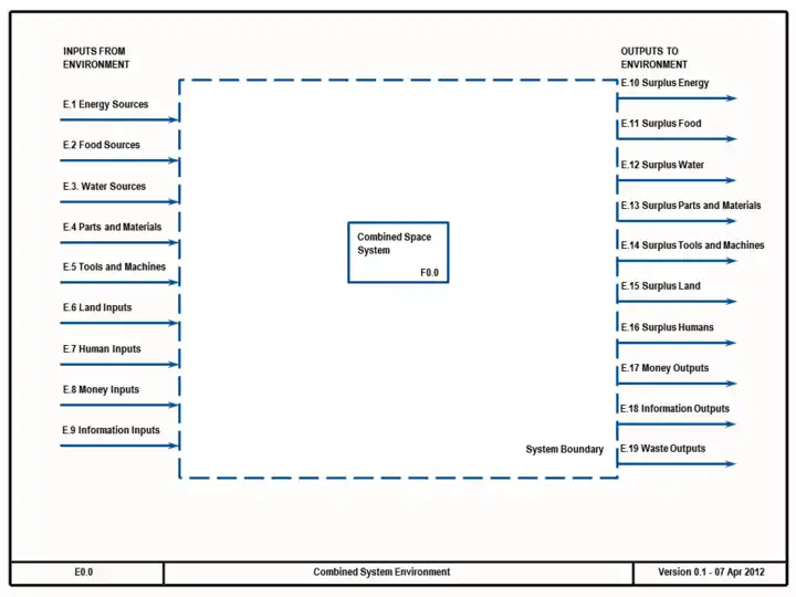 Given an identified need or desire, how does one select the best design to satisfy it out of the infinite number of possible solutions? For a complex project, the concept of a System has proven useful. A System is defined as a functionally, physically, and/or behaviorally related group of regularly interacting or interdependent elements. They are distinguished from the rest of the Universe by a System Boundary (Figure 1.5-1). A system is not a physical entity, but rather a mental construct, created because of it's usefulness, by drawing a line or surface around a collection of elements. The elements have internal relationships to each other and form a comprehensible whole. The rest of the Universe outside the system is referred to as the System Environment, or simply the environment. Flows of many types enter and leave the system as Inputs from and Outputs to the environment by crossing the system boundary . The scope of a given engineering task is then defined by the system boundary, what crosses the boundary, and what is inside. Systems may contain smaller systems within them, which are called Subsystems. These may be nested to any level, but flows into and out of a subsystem must appear in the parent system, or at the top level in the environment. This rule may be called Conservation of Flows - that flows do not appear from or vanish into nothing. Following that rule ensures that all the required inputs and outputs are accounted for.
