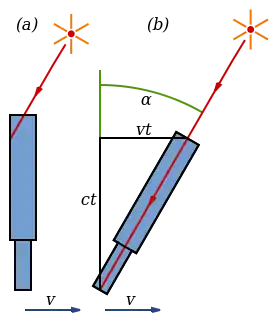 The speed at which the earth goes round the sun, v = 30 km/s, and the speed of light is c = 300,000,000 m/s which gives α = 20.5 seconds of arc every six months. This amount of aberration is observed and this contradicts the aether drag hypothesis.