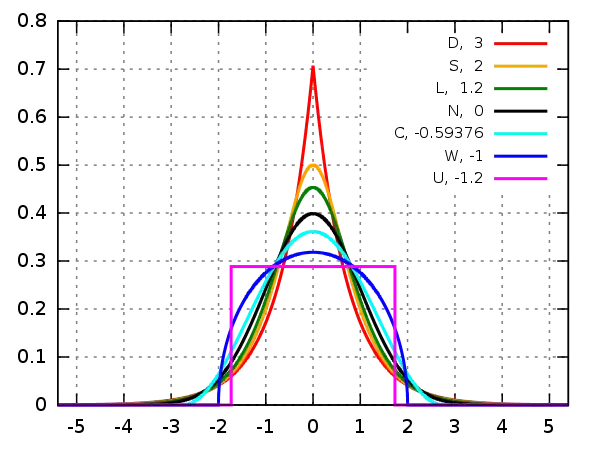 The following graph illustrates the kurtosis of some well known distributions. Note, however, that the tails are not easily seen in such density graphs: Even when the distribution has "fat tails," the tails are still close to zero and not easily compared. Thus, it is difficult to discern kurtosis from these graphs. A better way to visualize the tails in reference to the normal distribution (i.e., kurtosis) is to use a normal quantile-quantile plot.