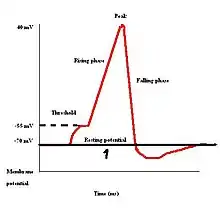 Action potentials are a means of communicating between neurons. An action potential is started when the membrane is depolarized to a certain threshold. Action potentials are all or none, so depolarizations that do not meet the threshold do not do anything for the neuron. The threshold is a point when the charge is -55 mV. The resting potential of a neuron, which is the charge at equilibrium, is around -70 mV. The threshold is 15 mV above the resting potential, and only when the cell depolarizes to this point will the action potential initiate. The action potential starts when voltage gated sodium channels are activated. These channels allow an influx of sodium. Potassium channels also open up, which causes an efflux of potassium ions. The efflux of potassium ions causes the membrane to hyperpolarize (makes more negative) the cell. If the current of potassium exceeds the current of sodium, then the voltage of the cell returns to -70 mV, which is the resting potential. If the voltage increases past the threshold level, then the sodium current is larger than the potassium current. This induces a positive feedback, where more sodium channels are opened (slowly) from this effect, and even more sodium ions enter the cell. This sharp increase in the flow of sodium ions causes the cell to depolarize rapidly, which results in the cell “firing”, which produces an action potential. The rapid depolarization is ended when the sodium channels open all the way. This causes the membrane voltage to reach a maximum. The voltage shuts the sodium channels off, and the channels are inactivated. At the same time, the voltage opens voltage gated potassium channels. The result of these two actions is the repolarization of the membrane. As potassium ions leak out and sodium channels can no longer diffuse across the membrane, the cell is brought to its equilibrium potential.