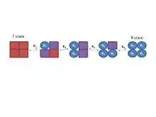 There are two main models of cooperativity for hemoglobin. One of these is the concerted model of cooperativity. This model states that the hemoglobin molecule changes rapidly between its R- and T-states in order to maximize its affinity for oxygen. According to this model, hemoglobin is constantly "flipping" back and forth between states in an attempt to bind as much oxygen as possible. The other model is the sequential model of cooperativity. This model maintains that one strand of hemoglobin starts a sequence of conformational changes in hemoglobin that increase its affinity for oxygen. When one strand of hemoglobin binds oxygen, the hemoglobin rearranges in a manner that favors additional oxygen binding. When the next oxygen is bound, another conformational change occurs to further supplement binding; Thus, hemoglobin can sequentially increase its affinity for oxygen as more and more of its strands bind oxygen.