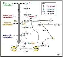 An important glucosamine, Hexosamine biosynthetic pathway (HBP), which is a prominent precursor in the synthesis of glycosylated proteins, accommodates a collection of metabolic components that are relative to the formation of Uridine diphosphate N-acetylglucosamine (UDP-GlcNAc). To do this, the HBP integrates various metabolic inputs that will essentially deliver the synthesis of UDP-GlcNAc, which is implicitly the donor substrate for OGT. Seemingly, a rise in cellular glucose and flux to a particular level of concentration via HBP will increase UDP-GlcNAc levels to a certain degree. Slight increases in UDP-GlcNAc concentration will suffice O-GlcNAc to function as a nutrient sensor. This is due to the unique responsive property of O-GlcNAc transferase to UDP-GlcNAc concentrations. Rising levels of flux via the HBP causes a resistance for insulin. Flux through the HBP, which leads to the production of UDP-GLcNAc and O-GlcNAcylation are influenced by diseases like diabetes and cancer through metabolic effects. Studies have proven that O-GlcNAcylation play a strict role in insulin signaling. When there is O-GlcNAc and OGT that disrupt insulin signaling, the antipodal of decreased O-GlcNAcylation and O-GlcNAcase stimulate proper insulin signaling. Under specific diabetic conditions, such low levels of O-GlcNAcylation are advantageous in the sense it relieves hepatic insulin resistance and saves the diabetic cardiomyocytes functionality.