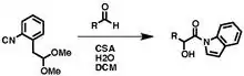The general synthetic approach at obtaining an activated amino acid will be described herein. Reaction of a specific isocyanide with an arbitrary aldehyde yields and alpha-hydroxy indole species [2].