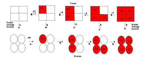 The Concerted Model, also known as MWC model or symmetry model, of hemoglobin is used to explain the cooperativity in oxygen binding as well as the transitions of proteins made up of identical subunits. It focuses on the two states of the Hemoglobin; the T and R states. The T state of the hemoglobin is more tense as it is in the deoxyhemoglobin form while the R state of the hemoglobin is more relaxed as it is in the oxyhemglobin form. The T state is constrained due to the subunit-subunit interactions while the R state is more flexible due to the ability of oxygen binding. The binding of oxygen at one site increases the binding affinity in other active sites. Thus in the concerted model of the hemoglobin, it shows that the one oxygen binding to an active site will increase the probability of other oxygen binding to the other active sites. In a concerted model, all oxygen binding sites on Hemoglobin in the T state must be bound before converting to the R state. This is also true in the conversion from the R state to the T state, in which all bounded oxygen must be released before full conversion can take place. At each level of oxygen loading, an equilibrium exists between the T-state and R-state. The equilibrium shifts from strongly favoring the T-state (no oxygen bound) to strongly favoring the R-state (fully loaded with oxygen). Overall, oxygen binding shifts the equilibrium toward the R state. This means that at high oxygen levels, the R form will be prevalent and at lower oxygen levels, the T form will be prevalent. Allosteric effectors of hemoglobin, such as 2,3-BPG, function by shifting the equilibrium towards or away from the T-state, depends on whether it's an inhibitor or a promoter. This model and the sequential model displays the extreme cases of R and T transitions. In a real system, properties from both models are needed to explain the behavior of hemoglobin.