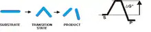 There is a few important topics to note. If the active site of the "enzyme" is complementary to the substrate, then ΔG is raised. The “enzyme” does not enhance the reaction and stays bound. If the active site is complementary to the transition state, then ΔG is lowered and the enzyme enhances the reaction. ΔG for forming the transition state is favored by the energetics of weak interactions between the enzyme and the transition state.