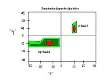 - Alpha helix falls within quadrant 1 (left-handed helix) and 3 (right-handed helix) in the Ramachandran diagram