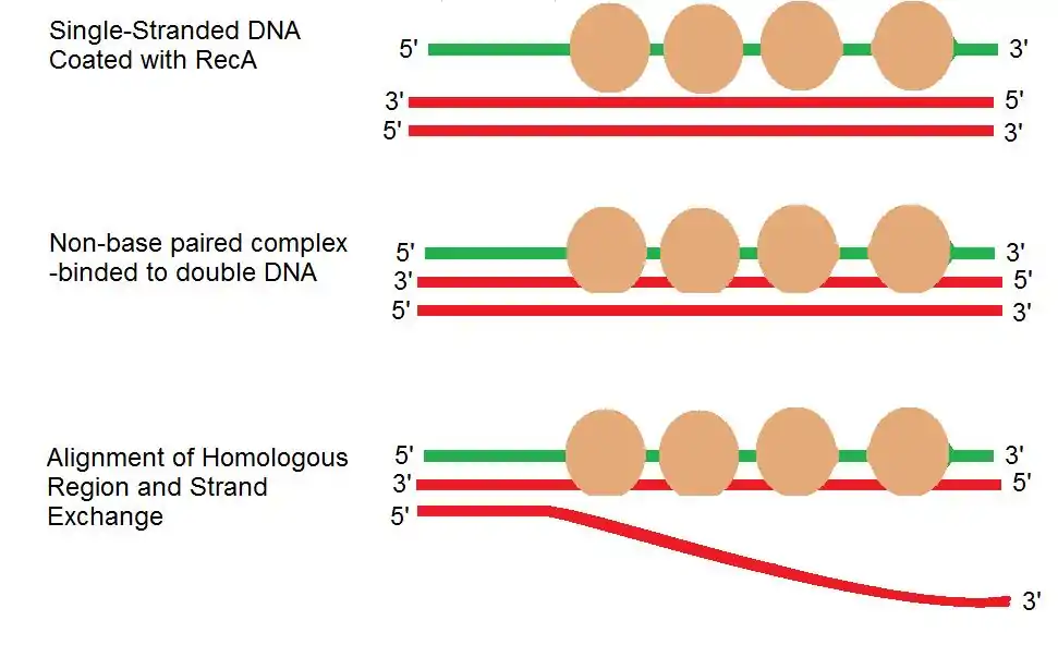 RecA can be found in E. Coli and it is needed in order to repair and maintain DNA. A structural and functional homolog for Rec A can be found in every species and as a result, it is used as a method to exchange genetic information by homologous recombination through sexual reproduction. RecA has multiple functions, all of which are related to DNA repair. Its main function which has been most widely studied is that it facilitates DNA recombination in order to repair DNA double strand breaks. The RecA protein can catalyze one directional branch migration. This function makes it possible to complete recombination. Bacterial strains such as E. Coli that are lacking RecA are useful for cloning procedures.