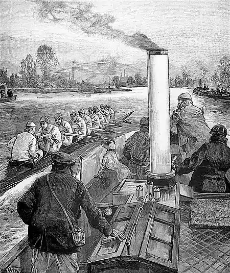 Emmanuel, who were in second station, had been coming up fast, and were now only about 50 yards off. By common consent the race was practically over. Not so to “Muttle.” It was said that the water washed out of the Cam by “Muttle’s” blade rolled in huge waves to the tow path. At the Railway Bridge the crews were level again, but it seemed to most people that Third could not continue with their heavy 13st. 10lb. man bumping about on the metal slide-way and the three light men trying to keep time with him at over 40. However, “Muttle” called out for a “thick ‘un,” and on they went. From the Railway Bridge he put in a number of these “thick ‘uns” of his, until Third, rowing 44, and steered a perfect course by “Muttle,” got their gun and won the race by a second amid great excitement. There was a vast to-do among the timekeepers in comparing watches when it was discovered that the time was 10min. 26sec. -- 21sec. faster than the previous year’s record for the course.