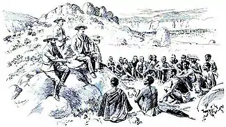 Military intelligence at the time thought that capturing the Mlimo would be the speediest way to end the war.[9] The location of the Mlimo's cave had been disclosed to the native commissioner at Mangwe, Bonar Armstrong, by an unnamed Zulu informant.[10] Armstrong immediately brought this information to the Chief of Scouts, Burnham, and the two men presented it to the Administrator of Southern Rhodesia, Earl Grey.[11] The Administrator instructed them to present this information to the military commander, General Carrington, who called in his Chief of Staff, Baden-Powell.[11] Carrington instructed Burnham, Armstrong, and Baden-Powell to leave that very night to "Capture the Mlimo if you can. Kill him if you must. Do not let him escape.".[10] Intervening news of enemy movements near Bembezi forced Baden-Powell to go there instead, so Burnham and Armstrong proceeded on their own to the Matopos.[12][13]