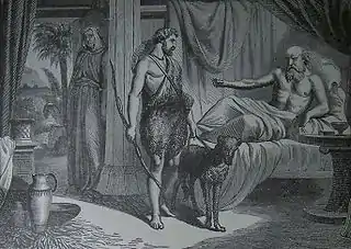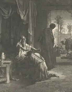 Just as Jacob left, Esau returned from the hunt, prepared a dish for Isaac, and asked Isaac for his blessing. Isaac asked who he was, and Esau said that it was he. Isaac trembled and asked who it was then who had served him, received his blessing, and now must remain blessed. Esau burst into sobbing, and asked Isaac to bless him too, but Isaac answered that Jacob had taken Esau’s blessing with guile. Esau asked whether Jacob had been so named that he might supplant Esau twice, first taking his birthright and now his blessing. Esau asked Isaac whether he had not reserved a blessing for Esau, but Isaac answered that he had made Jacob master over him and sustained him with grain and wine, and asked what, then, he could still do for Esau. Esau wept and pressed Isaac to bless him, too, so Isaac blessed him to enjoy the fat of the earth and the dew of heaven, to live by his sword and to serve his brother, but also to break his yoke.