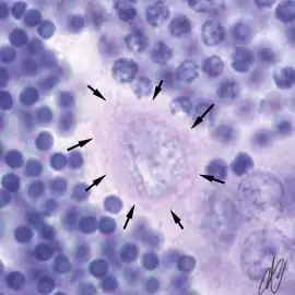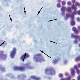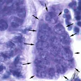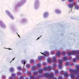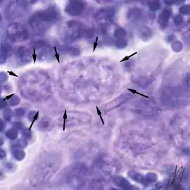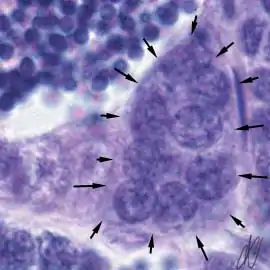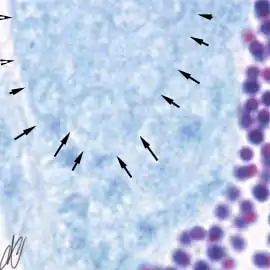 1. spermatogonium A (SgA) [arrows]: large single cell, with a large hypochromatic nucleus; early spermatogenic stages do not stain with Putt's carbol fuchsin. SgA divides mitotically to renew itself and to produce: