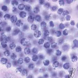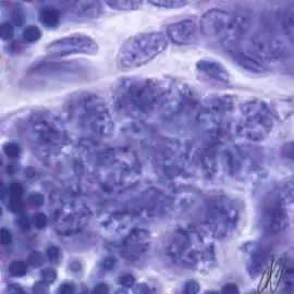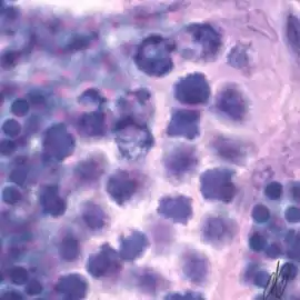 10. pachytene primary spermatocytes; in this stage, there is longitudinal contraction of the chromosomes, and the chromatin strands have a coarse appearance.