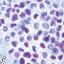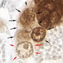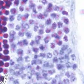 3. early spermatogonium B (eSgB) [arrows in left image]: morphologically indistinct from SgA, appears in clusters of 2-4 cells; there is moderate mitotic activity in spermatogonium B, as indicated by PCNA immunostaining [arrows in right image]; in contrast, there is only very light PCNA immunostaining in the single spermatogonium A cell [red arrows in right image]. Early SgB divide mitotically to produce: