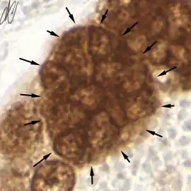 4. late spermatogonium B: smaller than early SgB, clusters >4 cells [arrows in left image]; there is high mitotic activity, as indicated by the strong PCNA immunoreactivity [arrows in right image].