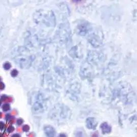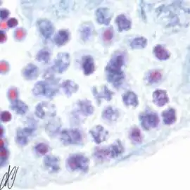 5. late spermatogonium B: clusters >4 cells [arrows]. Late SgB divides to yield smaller primary spermatocytes. Primary spermatocytes undergo meiosis, which consists of DNA duplication (yielding tetraploid cells: two copies of each chromosome, each copy consisting of two sister chromatids), genetic recombination, and two maturation divisions. The product of the first maturation division are secundary spermatocytes (diploid: one copy of each pair of chromosomes, consisting of two sister chromatids), the second maturation division yields spermatids (haploid). The first maturation division takes days, and therefore the successive stages of this division can easily be discerned: