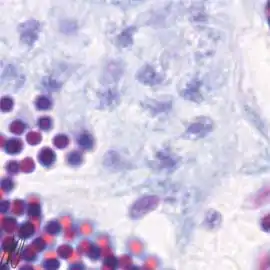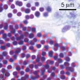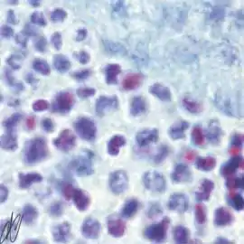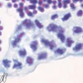 7. spermatocyte, leptotene stage of meiotic prophase, progressing to the zygotene stage; Note that there is staining with Putt's carbol fuchsin from this stage on, although still faint here.