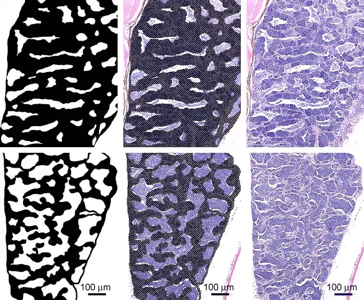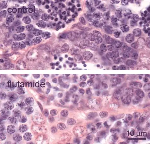 Adult male zebrafish, control (top), and exposed to 1 mg flutamide /L (bottom); H&E staining