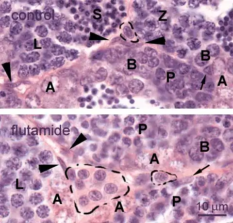 Leydig cells [outlined], also known as interstital cells, are found in the interstitial space between the testis tubules. These cells have regularly shaped round or oval nuclei. In the control testis, they occur solitairy or in small clusters; larger clusters are observed after exposure to the anti-androgen flutamide, shown here [lower image] for comparison. Occasionally, such larger clusters may also be present at the periphery of the control testis. Note, that apart from Leydig cells, other cells [arrowheads], such as fibroblasts and smooth muscle cells, are also present in the interstitium.
