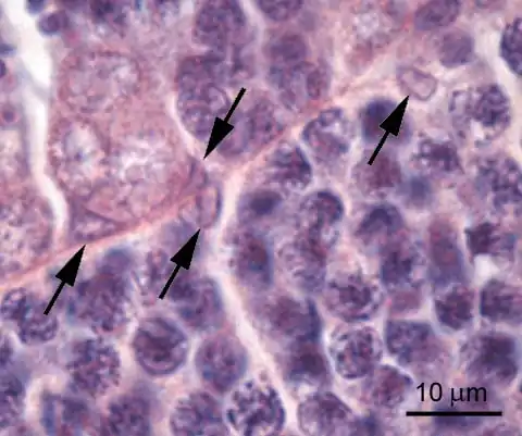 Sertoli cells [arrows] are characterized by their irregular shaped nuclei. These cells are found at the luminal side of the basement membrane of the spermatogenic tubules. They occur either solitairy, or in close association with the spermatogenic cysts, which they enclose; in this condition they are also known as lobule boundary cells.