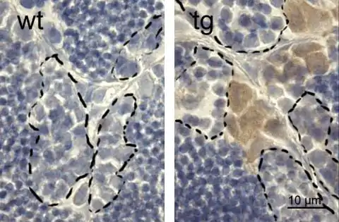 This immunohistochemical staining of paraffin-embedded sections using polyclonal anti-luciferase antibody shows expression of luciferase localized in clusters of spermatonia [brown staining]. From the spermatocyte stage on [outlined], germ cells are unstained, as are all cell types in the interstitium. Wild-type nontransgenic testis is completely negative.