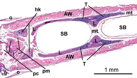 The testis [T] is a paired organ, located bilaterally between the abdominal wall [AW] and the swim bladder [SB]. At the level of this section, the testis is further bounded by the liver [L] and mesenchymal tissue [mt] (mainly adipose tissue); dorsally it is adjacent to the kidney and ventrally to the intestines (not visible on this level).