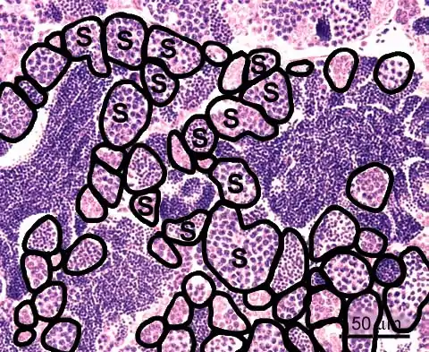 In the image below it is also evident, that the lining seminiferous tissue is built of clusters of cells, the so called spermatocysts [S].
