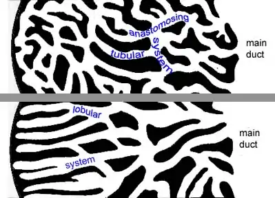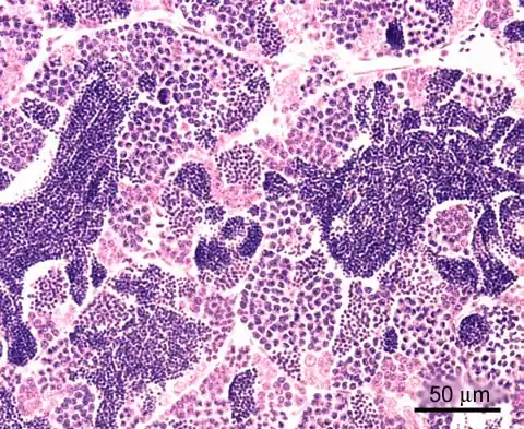 Spermatogonial cells occur randomly over the entire stretch of the tubules, and consequently, spermatocysts with various stages of maturation can be found anywhere. This organisation is referred to as "unrestricted", in contrast to the restricted testis type, where the spermatogonia reside at the periphery of the organ, directly under the covering tunica albuginea. These residual spermatogonia produce synchronously maturing cohorts of spermatocysts, which migrate simultaneously towards a central tubule or duct (Grier et al. 1980. Loir et al. 1995).