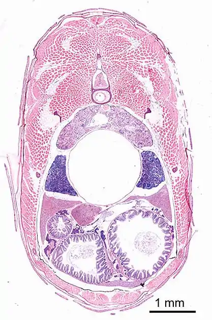 Coronal section of a juvenile male zebrafish, 15 mm (6 weeks); H&E staining