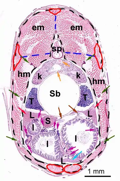 The horizontal skeletogenous septum [horizontal line] separates the epaxialis [em] and hypaxialis muscles [hm], which are inserted to this septum and to the spine [sp], and which are also bound to the skin. In the midline, the epaxial muscles insert to the vertical skeletogonous septum [vertical line]. Although organised in myotomes which are oriented perpendicular to the length axis of the fish, these muscles appear cross-sectioned due to their waved course [middle diagram]. The epaxialis includes the dorsal supracarinalis muscles [upper outline], the hypaxialis includes the ventral infracarinalis muscles [lower outline]. The lateralis superficialis muscles [left/right outlines] overlay the peripheral part of the horizontal septum. Pleural rib structures [arrows] can be observed within the hypaxialis.