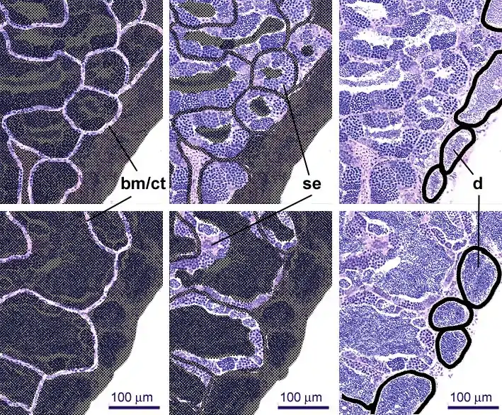 Each tubule is bounded by a basement membrane and a connective tissue sheet [bm/ct] (see Details below). Most tubules are covered with seminiferous epithelium [se], the structure of which is shown on the section below. Mature sperm is voided into the tubular lumen, which than serves as a storage compartment. The tubular lumen system is conntected to main efferent tubules (ducts [d]), which are located at the periphery of the organ (i.e. rostral and caudal poles, and the against median border, as shown here); these efferent tubules have no or only small clusters of seminiferous tissue. These areas should be avoided when analysing the status of the testis.
